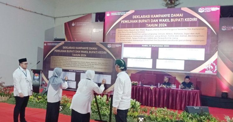 Selanjutnya Deklarasi kampanye damai di tanda tangani kedua paslon Hanindhito Himawan Pramana-Dewi Mariya Ulfa dan Deny Widyanarko-Hj Mudawah, Ketua KPU Kabupaten Kediri Nanang Qosim dan Ketua Bawaslu Kabupaten Kediri Saifudin Zuhri.