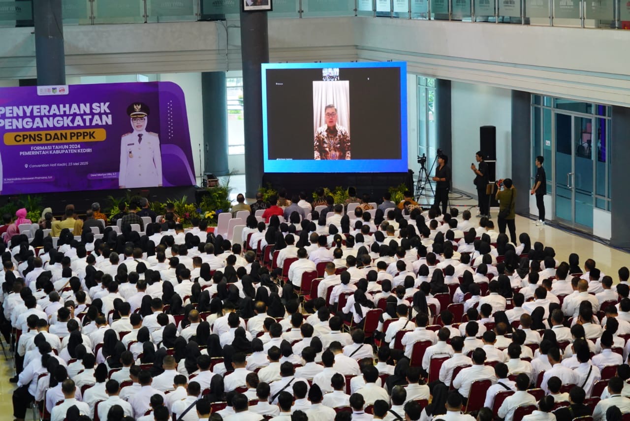 Pesan itu disampaikan Mas Dhito dalam sambutannya secara virtual di acara penyerahan surat keputusan pengangkatan CPNS dan PPPK formasi tahun 2024 di Convention Hall, Simpang Lima Gumul, Jumat (23/5/2025).