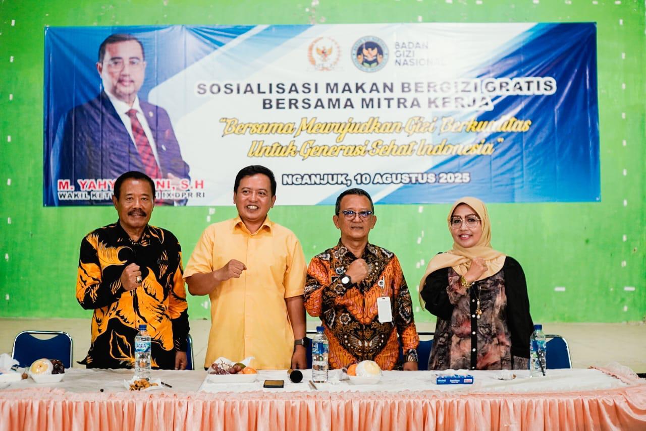 Acara sosialisasi program MBG dihadiri oleh Wakil Ketua Komisi IX DPR RI M. Yahya Zaini, Tenaga Ahli DPR RI M. Sam’ani Kurniawan, Analis SDM Ahli Madya Sekretariat Deputi Promosi dan Kerja Sama BGN Alwin Supriyadi, Direktorat Promosi dan Edukasi Gizi BGN Yasmin Nur Ditri, dan Tokoh Masyarakat Kab. Nganjuk Salik Ma’wal Murtadlo.